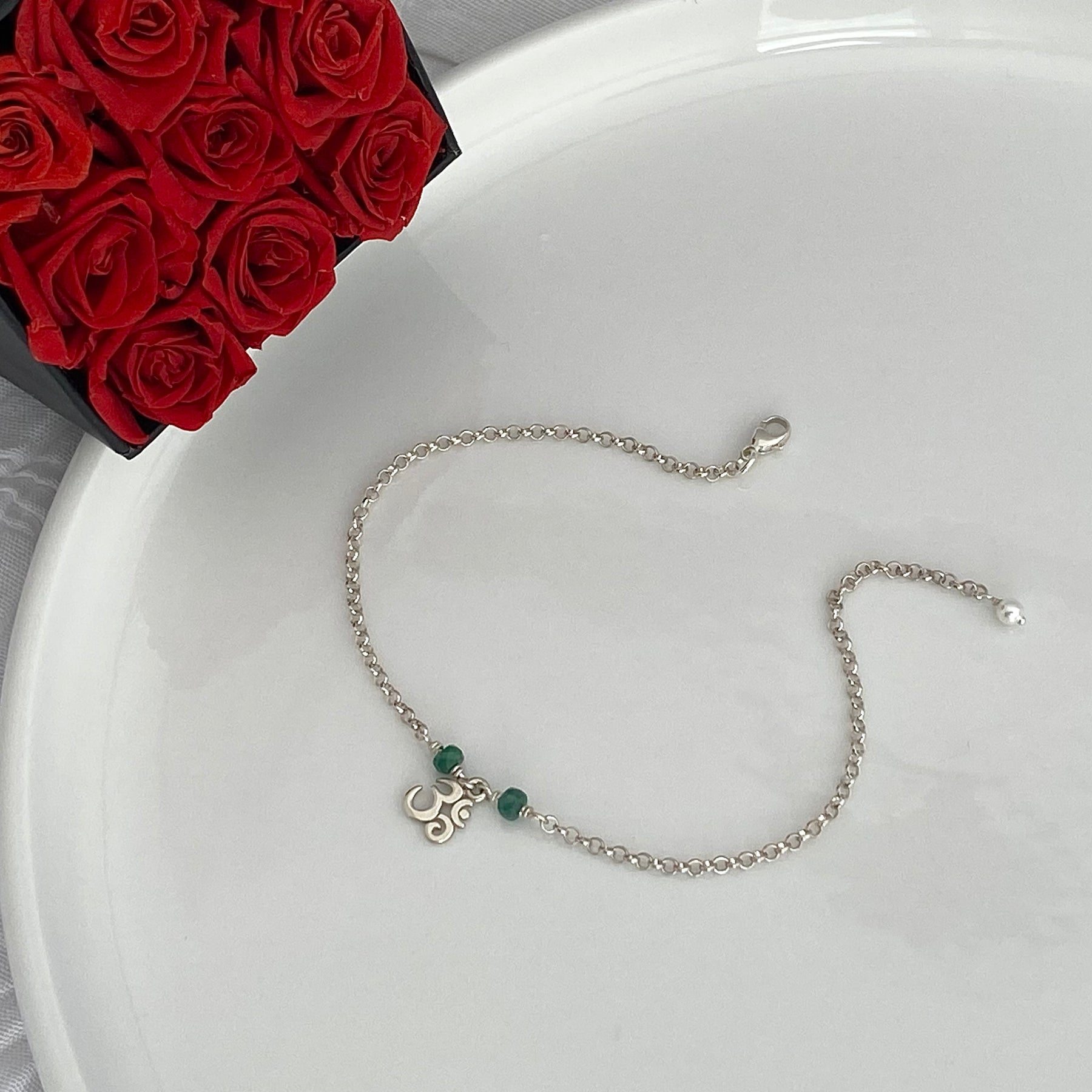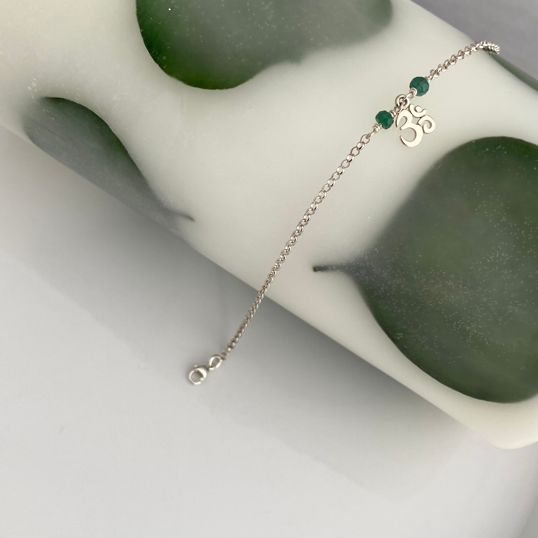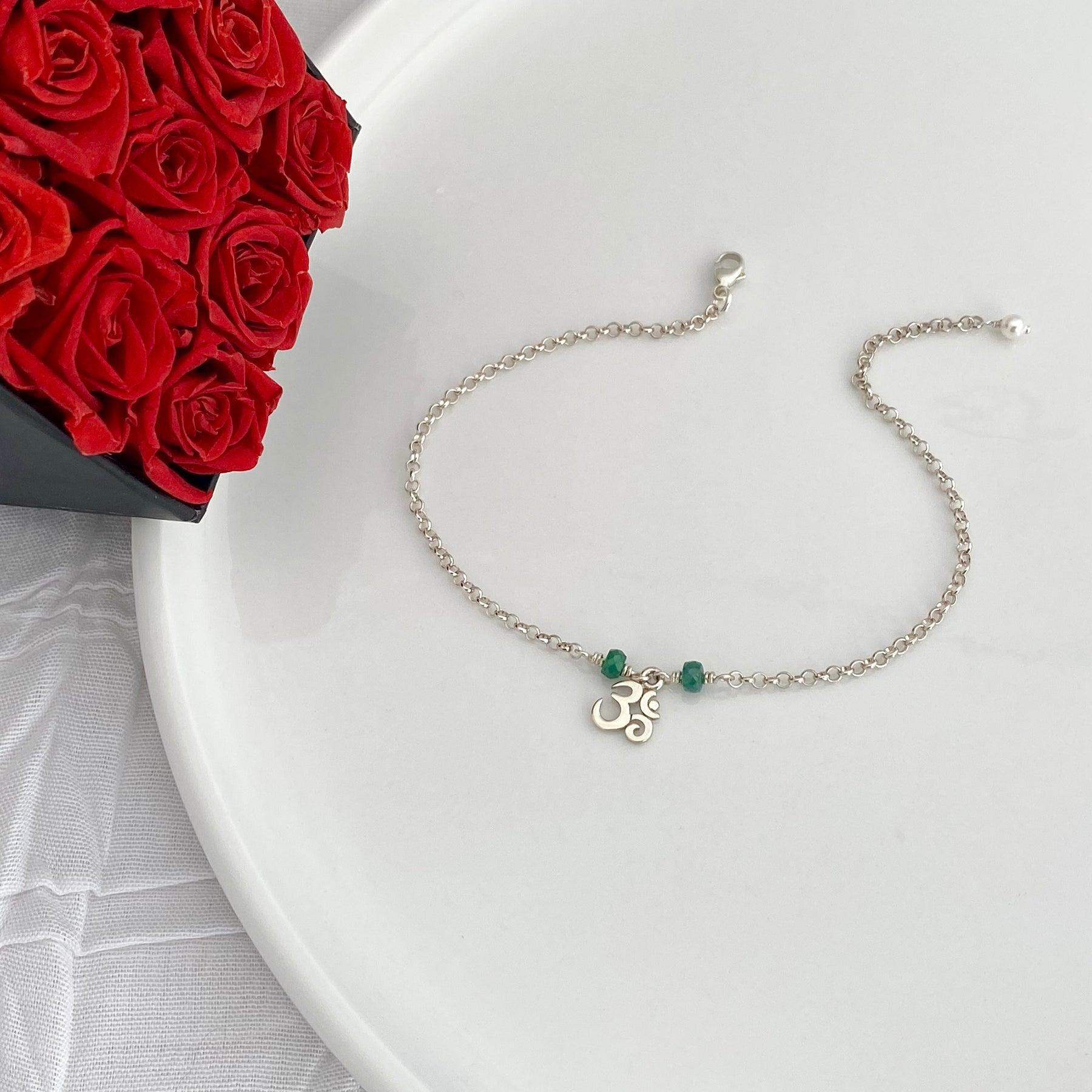 Embrace spiritual elegance with this stunning Om sterling silver bracelet, a meaningful piece that combines ancient symbolism with contemporary design. Crafted from premium sterling silver, this bracelet features an intricately detailed Om charm paired with a radiant emerald gemstone—or select your preferred stone to personalize your look. The emerald's lush green hue symbolizes harmony and renewal, making this bracelet both a beautiful accessory and a powerful spiritual companion. Perfect for daily wear or special occasions, this versatile piece serves as a gentle reminder of mindfulness and inner peace. Elevate your jewelry collection with a bracelet that speaks to your soul.